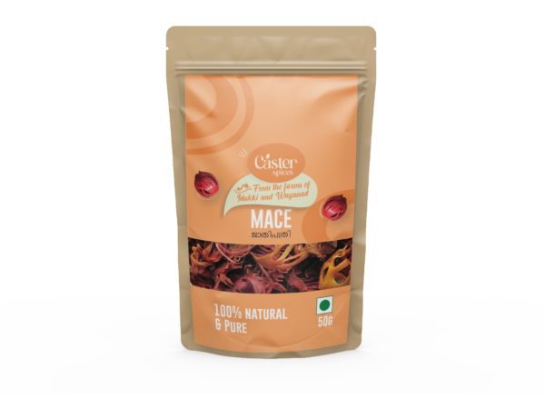 Mace is the spice made from the reddish seed covering of the nutmeg seed. Its flavour is similar to nutmeg but more delicate; it is used to flavour baked goods, meat, fish, and vegetables, and in preserving and pickling.